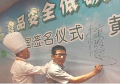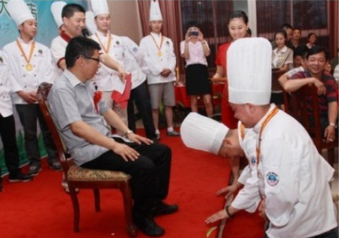 7月10號晚,“當(dāng)代四大名廚”陳緒榮在湖北黃石陽新舉行了盛大的收徒儀式!收徒儀式由大冶市烹飪餐飲業(yè)協(xié)會(huì)常務(wù)副會(huì)長兼秘書長羅文主持,黃石市烹飪餐飲業(yè)協(xié)會(huì)和大冶市烹飪餐飲業(yè)協(xié)會(huì)的眾多嘉賓到場祝賀,北京、江西和武漢等地的弟子專程前來賀喜。首先,我號召同行承諾推廣綠色食材和綠色烹飪的“生態(tài)宴”,并在“食品安全低碳環(huán)保‘生態(tài)宴’”簽名墻上簽字,大家踴躍寫上自己的名字;隨后,收徒儀式以傳統(tǒng)的拜師形式舉行,按跪拜、敬茶、頒發(fā)證書和合影等程序進(jìn)行;最后,嘉賓和弟子登臺發(fā)表致辭。
