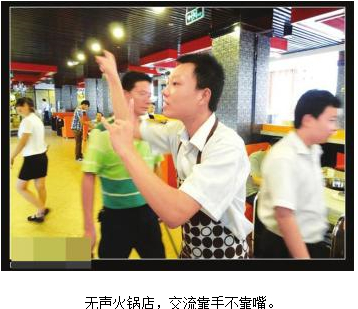 趙女士是聽朋友介紹好奇而來,“感覺有點(diǎn)怪怪的,也許習(xí)慣了在喧鬧中吃火鍋吧!盡管是聾啞人在服務(wù),溝通還是很暢通!”