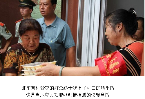 北車營(yíng)村村長(zhǎng)翟瑞生說(shuō),“村民已吃了近一周的方便面,湘鄂情送來(lái)的飯菜讓大家特別高興,終于可以換換口味,品嘗到新鮮可口的熱飯熱菜了!