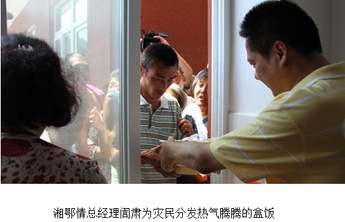 湘鄂情總經(jīng)理?肅親自帶著配餐車,趕到救災(zāi)現(xiàn)場(chǎng),向群眾分發(fā)盒飯。他表示,湘鄂情做為首家在A股上市的民營(yíng)餐飲企業(yè),向?yàn)?zāi)區(qū)人民奉獻(xiàn)愛(ài)心,是履行上市公司的企業(yè)社會(huì)責(zé)任,投身社會(huì)公益事業(yè)將是湘鄂情堅(jiān)守的核心價(jià)值和長(zhǎng)遠(yuǎn)追求。