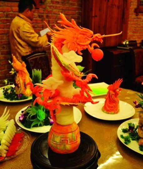 制作“中華龍”的涼菜名廚說(shuō),涼菜拼盤的制作過(guò)程,最考究的是廚師的藝術(shù)靈感和精湛、熟練的手工操作程度。自己從事廚師工作12年來(lái),所用于練習(xí)涼菜雕刻的蘿卜、南瓜、芋頭、萵筍等果蔬已達(dá)到3萬(wàn)多斤。