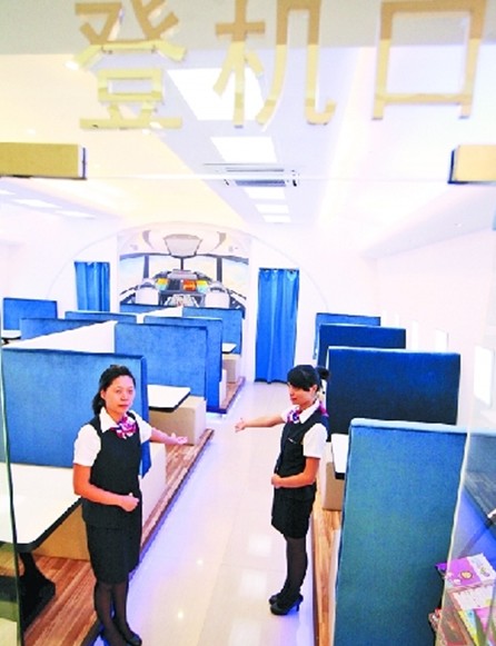 “歡迎登機!”一進入餐廳,你就能看到服務(wù)員彎著腰,做出歡迎的手勢。“我們的服務(wù)員都是參考空姐的標準來招收,要求身高160cm以上,長相清秀,笑容甜美等!秉S慧玲介紹說,服務(wù)員統(tǒng)一著空姐制服,上班前還得接受餐飲禮儀和空姐服務(wù)方面的培訓(xùn)。