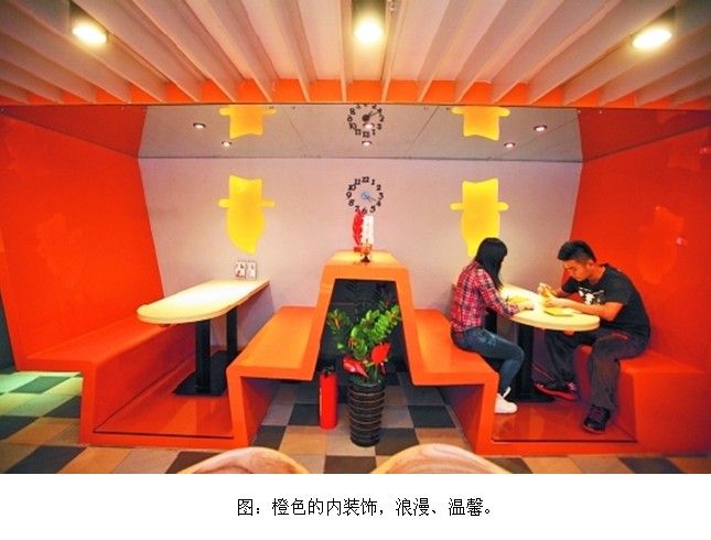 明明是家餐廳,入門卻有“登機口”三個醒目的大字。走進餐廳,就宛如進入機艙。餐廳的座椅仿效大飛機的樣式,中間是一張桌子,前后各配兩張椅子。座椅上方是行李架,樣式和飛機接近,只是略高,“行李架高一點,顧客坐著吃飯才不會有壓抑感。”店長黃慧玲說。餐廳窗戶的顏色和飛機一樣,也是乳白色,這種窗戶雖然比較不透明,卻更逼真。