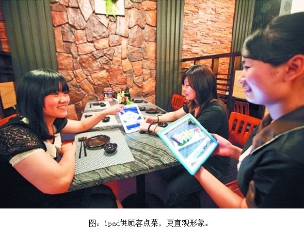到餐廳吃飯,首先要做的就是點菜。傳統(tǒng)的點菜方式都是服務(wù)員拿著一本菜單,供顧客選取菜樣,再把菜樣填在一張單上。T淘園內(nèi)的一家日本料理店卻別出心裁,使用ipad供顧客點菜。