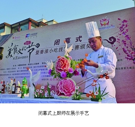 此次美食節(jié)閉幕式,不但集中展示了蟹黃湯包、蜜汁藕、麻團(tuán)、回鹵干等“2012秦淮小吃大賽”的獲獎(jiǎng)作品,還現(xiàn)場(chǎng)舉行了“第五屆中國(guó)南京美食文化節(jié)金陵名廚”大賽。10名來(lái)自江蘇酒家、真知味、小廚娘、漢府飯店等知名飯店的大廚,現(xiàn)場(chǎng)以“菊花魚(yú)”為題,PK廚藝。