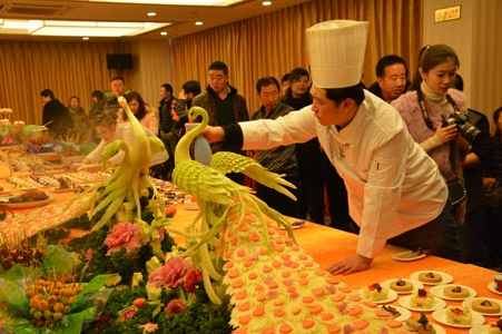 這121道菜品是充分利用一整頭人工飼養(yǎng)的野豬烹制而成,其體重在300斤以上,從頭到尾,加上皮、骨頭、豬腳、內(nèi)臟等都被名廚們烹制成了美味。由于菜式較多,烹制工藝復(fù)雜,所以前期籌備用了4天的時(shí)間,正式上灶烹制是在30日21時(shí)許,并于31日10時(shí)30分全部制作完畢。這么做的目的就是要保證各道菜品的食材優(yōu)良,菜色優(yōu)美,由此給觀賞者帶來(lái)視覺(jué)和味覺(jué)上的雙重享受。
