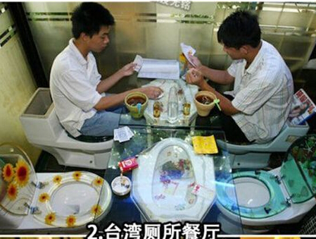 這家別具一格的餐廳是以廁所文化為主題設計而成的,顧客坐在抽水馬桶上,用類似于迷你馬桶的餐具食用各種美食菜肴。此外,這里還提供有類似大便形狀的巧克力冰淇淋,形象逼真,令人連連稱奇。值得一提的是,餐廳到處可見男女洗手間供用餐者使用,非常方便。這種讓你進“廁所”用餐的感覺,你敢去嗎?