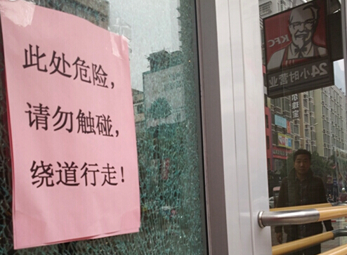 1月7日,記者在肯德基一樓門口看到,一塊鋼化玻璃被擊穿一個(gè)窟窿,整塊玻璃全部碎了,卻沒有掉下來。玻璃上貼了一張警示語(yǔ):“此處危險(xiǎn),請(qǐng)勿觸碰,繞道行走”。據(jù)一名肯德基員工稱,這塊玻璃可能是由于顧客在玩耍時(shí),不小心碰爛的,事情發(fā)生有一個(gè)多星期了。已經(jīng)訂了新的玻璃,但是還未到貨。