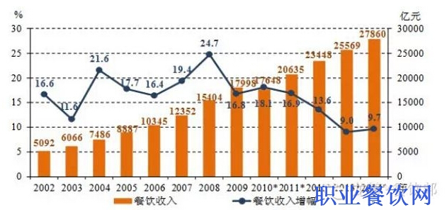 據(jù)國家統(tǒng)計(jì)局最新發(fā)布的數(shù)據(jù)顯示,2014年全國餐飲收入27860億元,同比增長9.7%,比上年加快0.7個(gè)百分點(diǎn),終止了連續(xù)三年增速下滑的頹勢。中國烹飪協(xié)會會長姜俊賢表示,按照這一增速,2015年中國餐飲業(yè)將邁入3萬億元新時(shí)代。