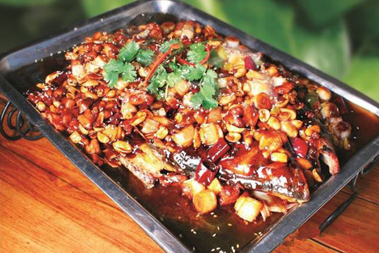 5、凈鍋下一半碗汁熬開、攪濃,起鍋淋到烤魚周圍。6、鍋下底油燒熱,加入干辣椒段15克炸至棕紅色,再放入花椒8克炸香,隨后下蔥丁30克、姜丁8克煸香,倒入雞丁翻炒均勻,烹入剩余的料汁快速翻裹均勻,撒入油酥花生米200克翻勻,調(diào)少許油辣椒起鍋蓋到烤魚上,點(diǎn)火上桌即成。