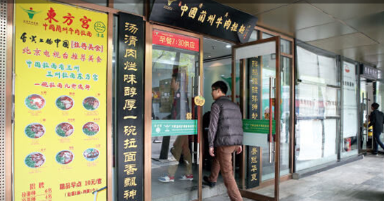過去的一年多時間里,梁建突然發(fā)現(xiàn)北京城的大街小巷里多了很多黃底藍字的招牌“東方宮中國蘭州牛肉拉面”,對此梁建的評價是“老實說很接近或者已經(jīng)達到了在蘭州本地吃面的口味”。