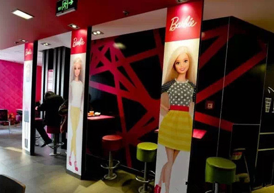 麥當(dāng)勞在北京、廣州、青島、重慶開(kāi)了多家芭比主題餐廳。店內(nèi)各個(gè)角度都設(shè)有高挑靚麗的芭比人形展板,椅背、墻面也被加上芭比元素,還有放滿整個(gè)櫥窗的迷你芭比娃娃系列,甚至連店員的服裝也是粉色。