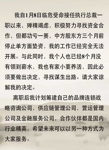 只可惜短短4個(gè)多月的時(shí)間,戚東就已招架不住,提出辭職。其在辭職信中坦言,自接任總裁一職以來,積極努力尋找資金合作,但都功虧一簣。中方股東也在三個(gè)月前就已經(jīng)停止單方面墊資,使得運(yùn)營(yíng)工作完全無法開展。而他本人已經(jīng)有8個(gè)月沒有領(lǐng)到薪水。