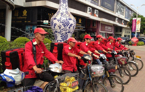 現(xiàn)在我有13個專職送餐員,4個兼職送餐員,還有外包物流公司的配送人員,一共20來個人,其中有總負(fù)責(zé)人。距離遠(yuǎn)的地方,我就放兩個人在那邊待著,餐廳的人像接力棒似的,25分鐘會過去一趟。高峰期就馬上放一個人過去,一趟送完再回來接力。中午最多是2個高峰期,11點(diǎn)半和12點(diǎn)。我也會按區(qū)域劃片,高峰期不同的區(qū)域會有不同的人負(fù)責(zé)。我對送餐員也會有培訓(xùn),高峰期不同的線路會互相支援。