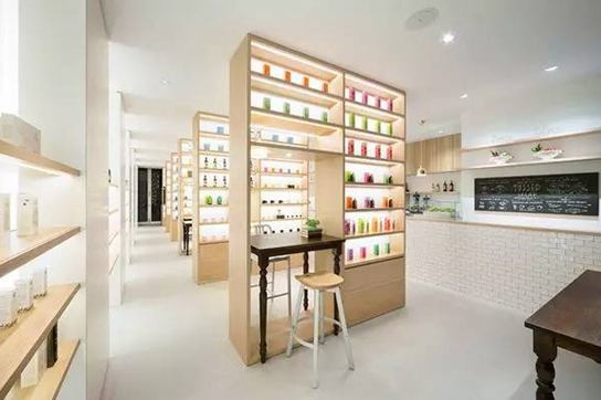 為了最大限度地突出產(chǎn)品本身,整個(gè)空間以白色為主色調(diào),Nendo 設(shè)計(jì)團(tuán)隊(duì)設(shè)計(jì)了很多原木材質(zhì)的擱架單元,從地面架起至天花板,就像是圖書(shū)館里的書(shū)架似的。書(shū)架內(nèi)置了白色透光性極強(qiáng)的發(fā)光裝置,映襯著放置在擱架上包裝色彩繽紛的產(chǎn)品,給人自然、溫暖的觀感。