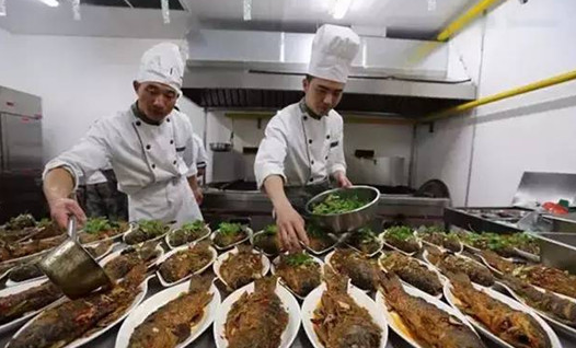 餐廳中,丁司務(wù)長正抱著一桶水往餐臺里倒,記者急忙走上去幫忙,原來他是在準備飯菜的保溫工作。5時40分,4道菜已經(jīng)擺放到加熱好的餐臺上。
