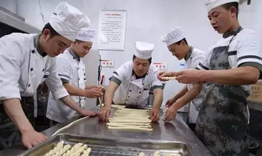 “鐺鐺……”清晨4時,鬧鈴響過后,司務(wù)長丁紅從床上彈了起來,他邊穿衣服邊喊著“起床”的口令。炊事班的一天就這樣開始了,有的同志整理內(nèi)務(wù),有的同志“占領(lǐng)”廁所,有的同志搶占洗漱臺。4時15分,準時開火,炊事操作間內(nèi),8名穿著炊事服的身影開始忙起來。