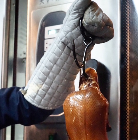 烤鴨一出爐,就會被立刻分割,如果沒有馬上做成漢堡送到運氣超好的客人的嘴里,就會把分好的鴨皮和鴨肉分開專門保溫。對烤鴨了解至極的大董專門為鴨皮和鴨肉分別設計了不同的保溫箱,溫度和濕度都不一樣,以保持剛出爐的風味。鴨子最多在里面呆四十分鐘,這是大董認為可以保持鴨皮噴香酥化、鴨肉多汁鮮嫩的完美狀態(tài)的時間范圍。在這個時間內沒有用完的鴨子,就不要了。