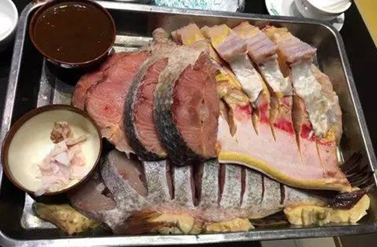 我們指著其中一缸里的魚(yú)說(shuō):這個(gè)多少錢(qián)一斤?廚房主廚回答:128元/斤。其實(shí)我也不知道那是什么魚(yú),養(yǎng)在缸里看著也很小條,就說(shuō)要不弄兩條?廚房主廚就立馬用網(wǎng)撈出兩條,看都不給我看一下,立即拍死在案!我還沒(méi)回過(guò)神呢,說(shuō)兩條你就弄兩條,我怎么知道那魚(yú)一條有多重啊!結(jié)果一稱,兩條魚(yú)9斤多!我們就4個(gè)大人1個(gè)小孩,明顯吃不完呀!老板喊冤