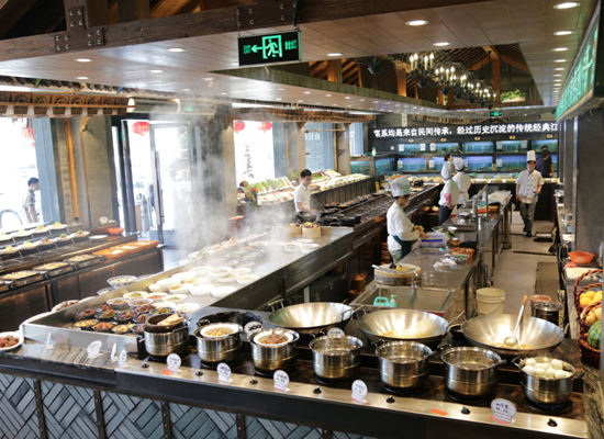 第一家店開了之后,生意很好,驗(yàn)證了之前他對(duì)市場(chǎng)的分析。又經(jīng)過(guò)一番準(zhǔn)備,2014年,江南大院的土菜文化博物館的大院模式出現(xiàn)了,江南大院的第二家店,面積逾4000平米。這家店在體量上滿足了江南大院對(duì)于土菜展現(xiàn)的要求,門口600多平米的明檔,更讓消費(fèi)者更直接體驗(yàn)到土菜的氣氛。