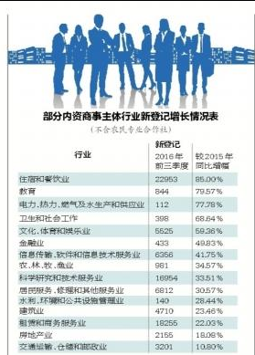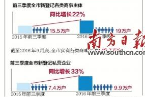 數(shù)據(jù)顯示,前三季度,全市新登記各類商事主體19萬(wàn)戶,同比增長(zhǎng)22%,新登記商事主體增速為近兩年來(lái)最高。截至2016年9月底,全市實(shí)有各類商事主體146.7萬(wàn)戶,高出全國(guó)平均增速8個(gè)百分點(diǎn)!