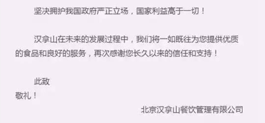 網(wǎng)友們表示,在本次愛(ài)國(guó)事件中炸出了漢拿山這么一個(gè)“漢奸”,當(dāng)初打著正宗韓餐的招牌賺得盆滿缽滿之后,現(xiàn)在出來(lái)劃清界限。但也是一個(gè)不可避免的現(xiàn)實(shí),因?yàn)槊鎸?duì)利益沖突的兩方,你的決定很難中立、獨(dú)善其身,必須得是偏向一方。這個(gè)不是公關(guān)的錯(cuò)誤,而是公關(guān)的常態(tài),是多數(shù)危機(jī)公關(guān)不得不面對(duì)的結(jié)局。