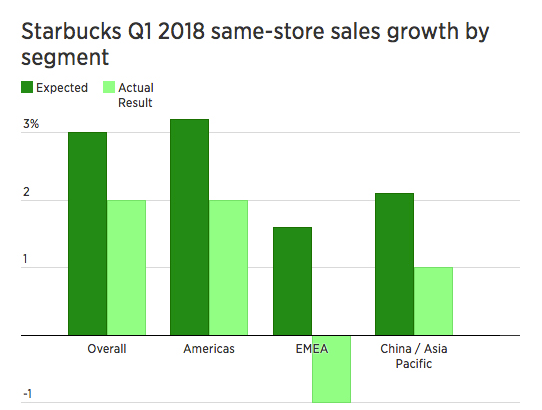 周四公布的2018財(cái)年一季度財(cái)報(bào)顯示,星巴克季度營(yíng)收上漲6%至60億美元,但是全球同店銷售僅上漲2%,不及StreetAccount預(yù)期的3%。